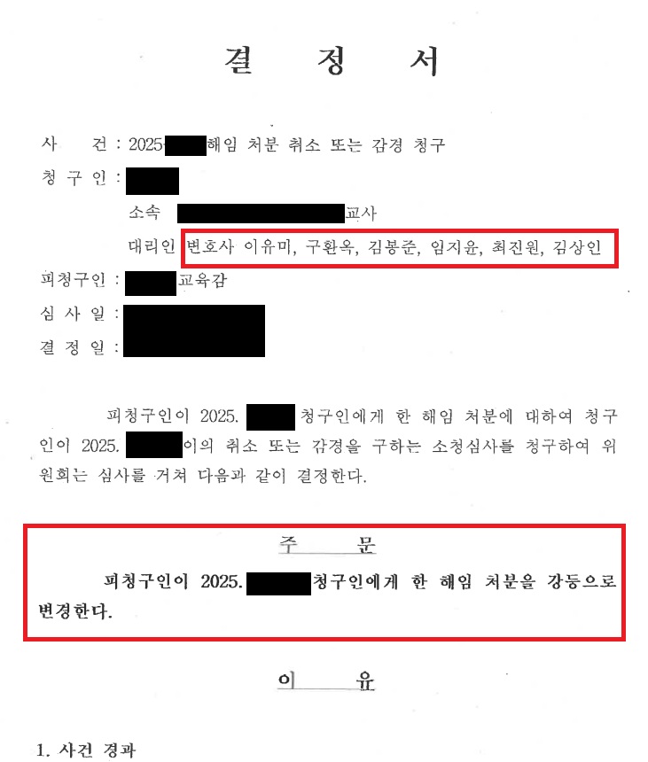 소청심사위원회에서는 구환옥 변호사의 변론을 받아들여 처분을 해임에서 강등으로 변경하였고, 이를 통해 고객은 공직으로 복귀할 수 있게 되었습니다.